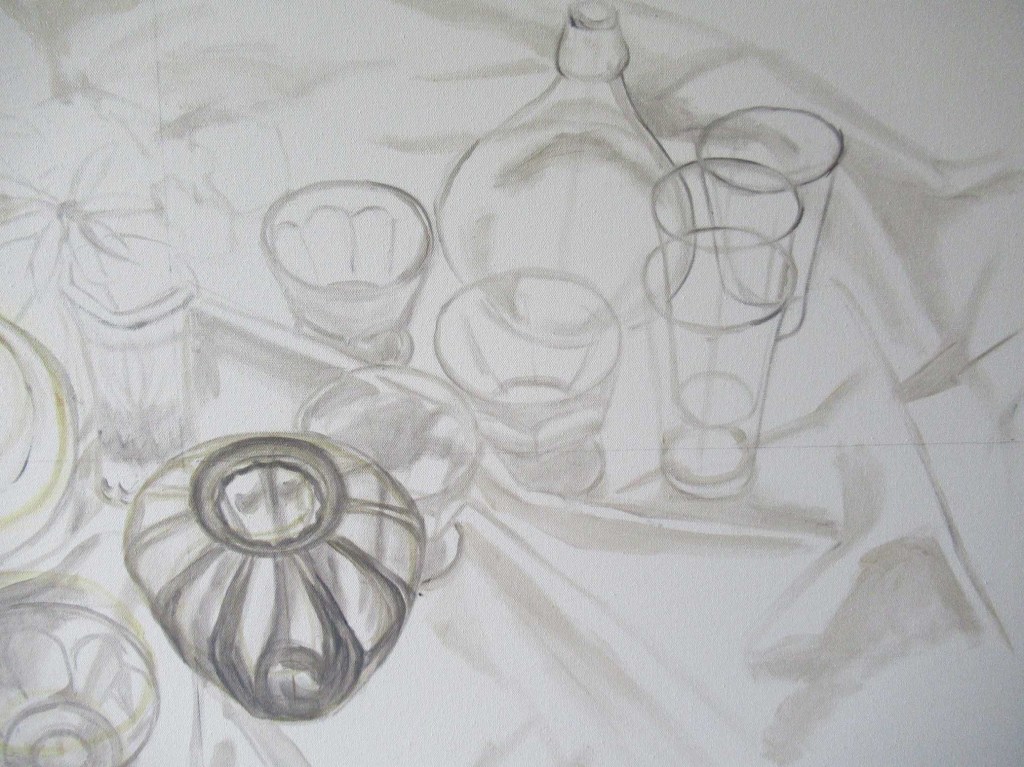 A very cloudy day and endless errands to run hither and yon. So the best I could do was to begin laying in some of the fabric folds and shadows. Somebody asked if I used charcoal for this. No. I use a thin wash of a grayish oil color. It’s easy to wipe off if necessary. The problem with charcoal is that when you start painting over it, it smears and blends into the paint, turning it a gloppy gray.