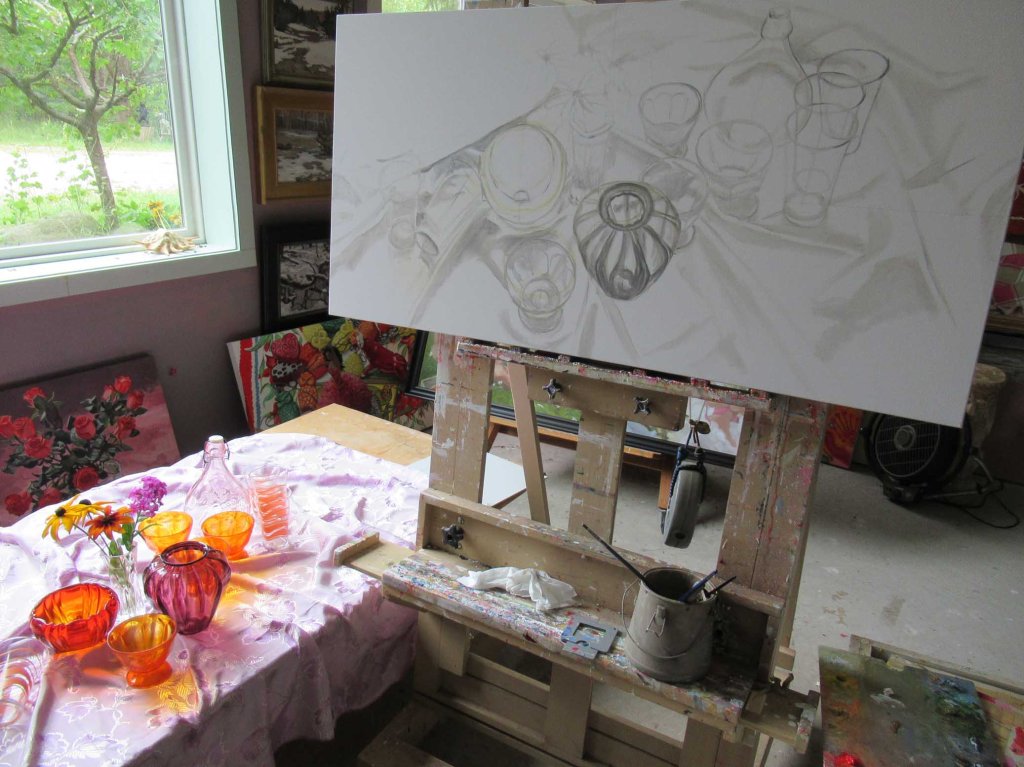 End of Day 3. It was overcast all day. No clear, bright sunshine/shadow patterns, so I had to settle for drawing the glass shapes — and the fabric folds. I treat fabric folds like mountain ranges, painting them with thin washes of gray. After they’re dry I’ll go back with color and patterns.
