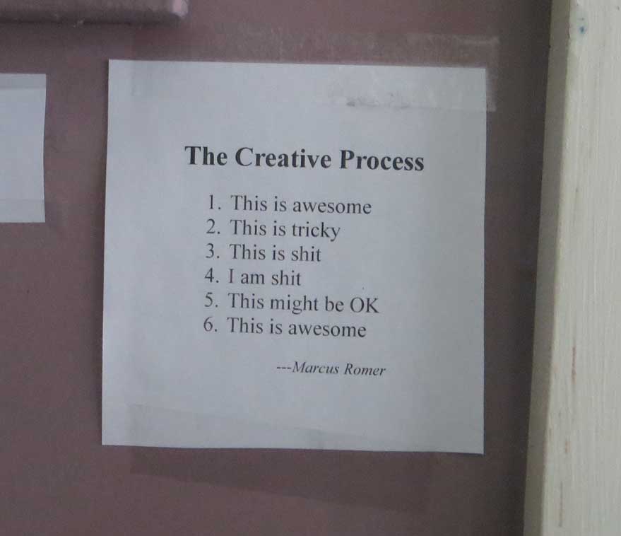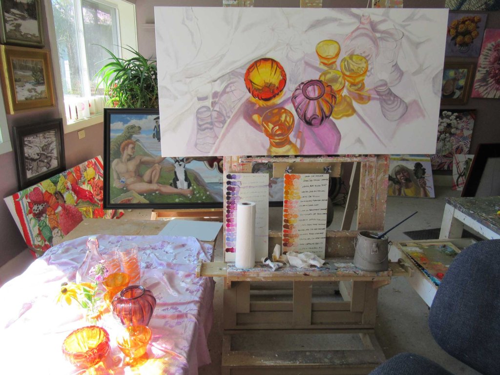 As of this aftenoon, I’m at Stage 3. But never fear — I’ll most likely poke and daub and claw myself over to Stage 5 in a few days. I remember watching the great landscape painter, Clyde Aspevig, doing a plein air demonstration for our class. At one point he turned around and said, “This is where a beginner would quit. But I know how to fix this!”