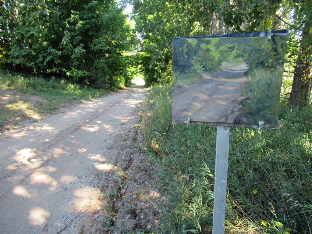 Of course you know I love painting roads. Especially the shady ones! This was the first painting I did today, over on Shooks Road, just north of Bennett Hill Road in Antrim County. Here’s my setup (below):