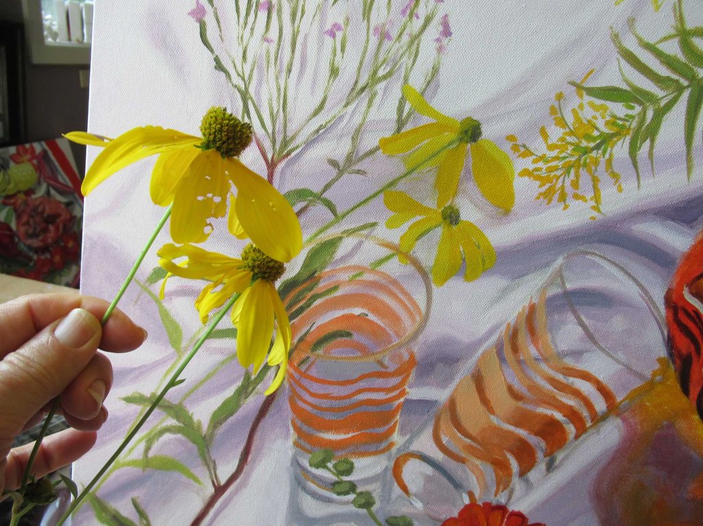 Day 10 for this one! I added a few more zinnias from my garden and a stalk of blue vervain and a chunk of hollyhock. A Facebook friend suggested I paint my hand in there. Hmmmm…. maybe!