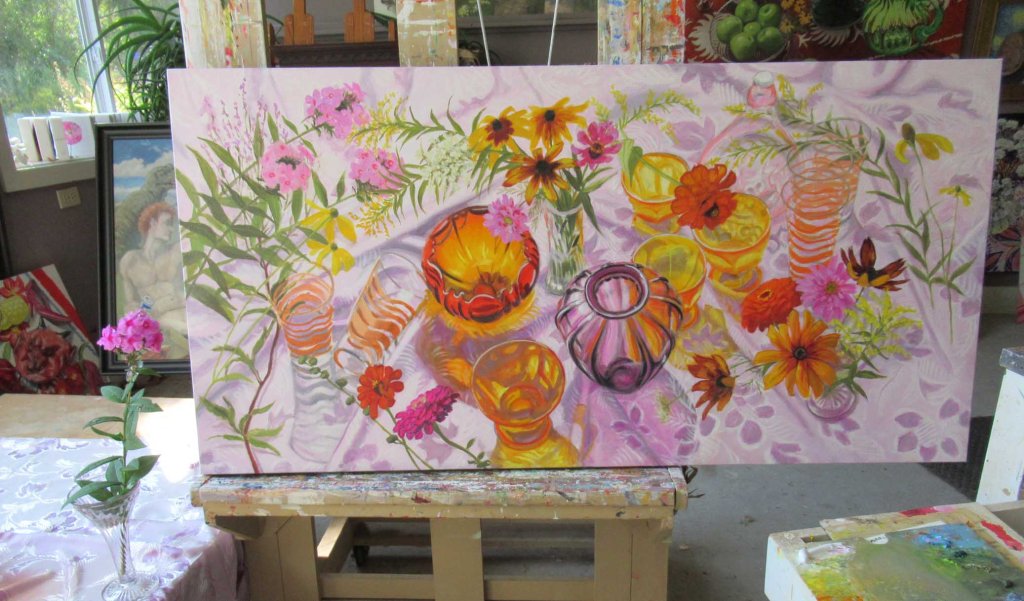 I confess. This painting has NOT been my favorite. I have not enjoyed watching you paint. WOW! Now that it is almost done, I love it! The greenery gives it such delicate flair. This is one I would enjoy seeing daily!