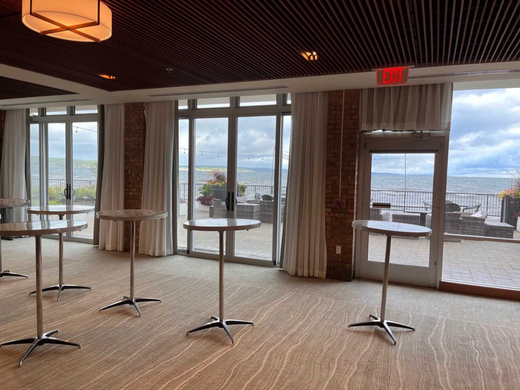 En Plein Air — painting “in plain air”, supposedly. This time we painted inside, looking out the windows at Grand Traverse Bay. Crooked Tree Art Center had lined up a handful of us plein air artists to show up and paint during a big event at Delamar (a ritzy resort in Traverse City). Emails went out in the afternoon, advising us of changed plans becaise of very high winds. See photos of our setup area (below). Could you imagine trying to paint these views? My favorite artist (and revered teacher, Clyde Aspevig) can set up his easel in the middle of a field of nothing but weeds and still come up with a masterpiece. OK — I took this as a challenge.
