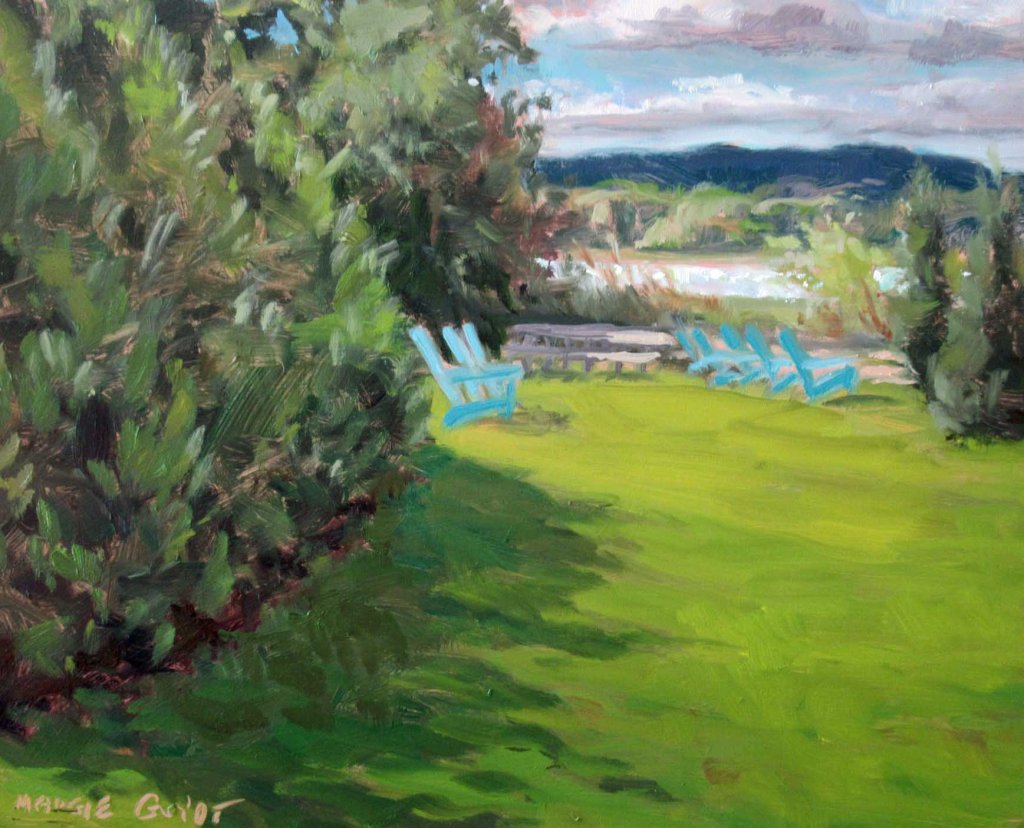 Here’s another view out a window. The light kept changing. Had to keep on my toes. The only brush I had with me was a #4 flat. Thank goodness it wasn’t too frayed. Delamar had worked hard to create a beautiful outdoor seating area….