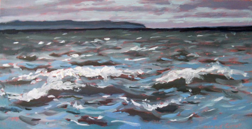 The four of us set up our easels along the windows and doggedly began painting as a handful of hardy swimmers splashed in the surf. Waves on the lake? I’d never really painted many crashing waves before, but what else was there to do? Seems like the experiments never end.