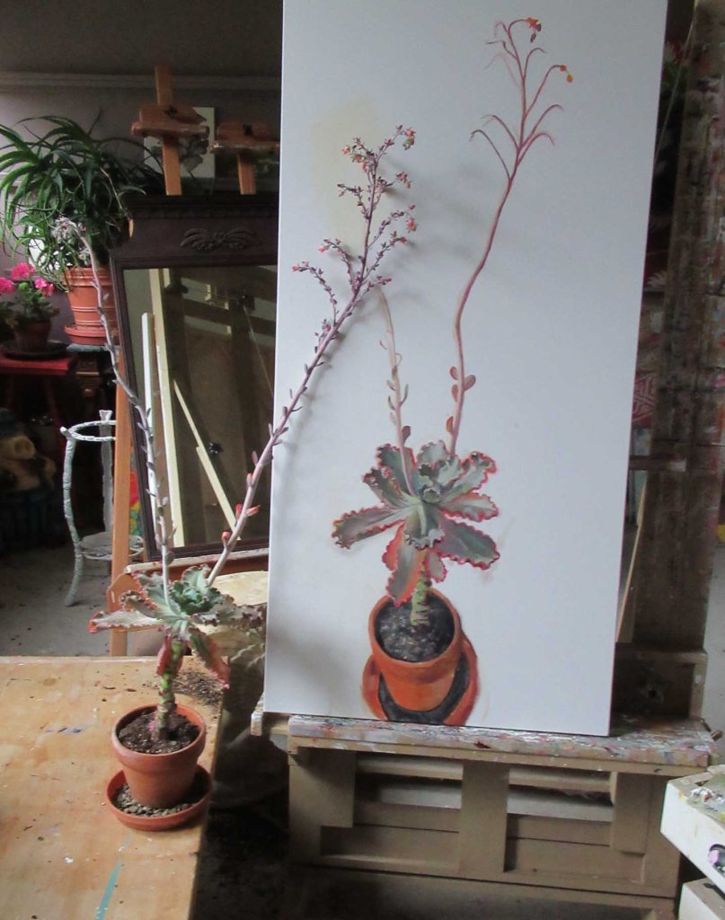 Garden chores have been my #1 job lately: putting up deer fences, transplanting young trees out into the swamp and bulb-planting. Painting has had to wait. Now we’re having a long spell of rain and graupel*, so I ventured back into the studio to tackle this baby. It’s at the “miserable” stage of slugging away while being nagged continually by a cat treat-addicted cat. I still have a plan for this. And there still are about 300 bulbs to plant. Alas — a good day for a nap….