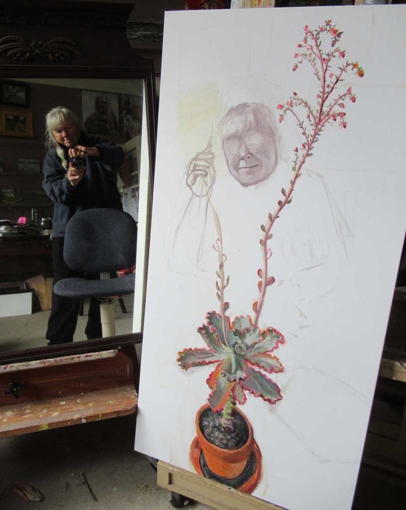 After spending most of the morning planting crocus bulbs and lilies – and doing laundry – I made it out to the studio to try to draw in my face and hands. I sit in front of a big mirror and gaze at that. There was something about the eyes today that just didn’t quite jive. Enough already! I wiped out what I had and quit. Time for a nap with the kitties. Tomorrow is another day.