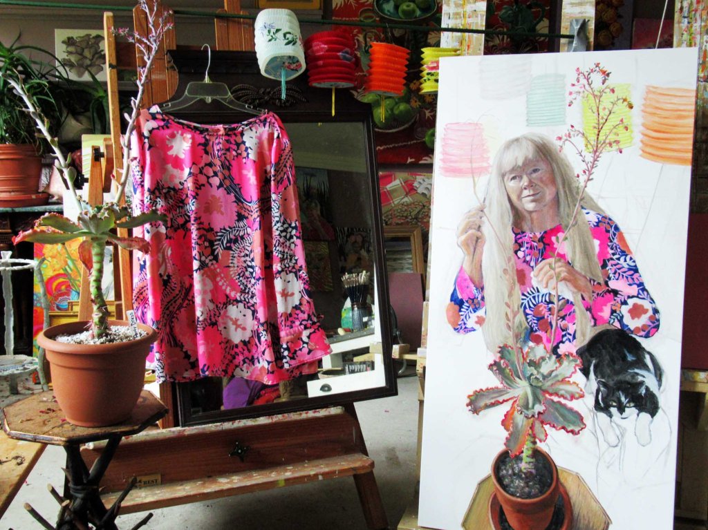 There is no posting for Day 6. Monster-winds ripped through this area of NW Michigan, knocking out most everybody’s electricity. Mine’s still out. Before that, my computer wasn’t working. Very mysterious! Today it’s back. Go figure! But I did paint — what else was there to do? — so let’s call this Day 7. What’s new? Hints of Japanes lanterns magically appear in the background. Started coloring in my hair and skin tones a little. Worked on that crazy shirt pattern (and boy, it’s a challenge!). Tomorrow I just might turn that shirt into a dress. Meanwhie, the automatic generator continues howling on, minute by minute, burning through my expensive LP gas. Sigh….
