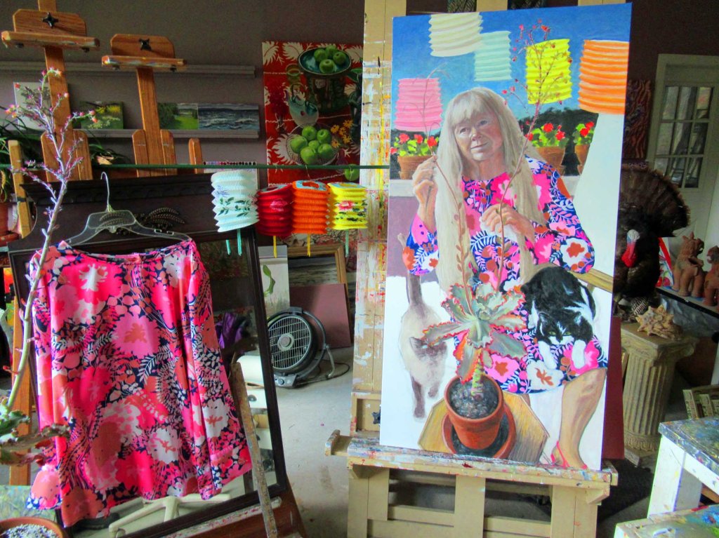 It was cold and rainy all day, so I was happy to sit in a nice, semi-warm studio for a change. I worked on the background a little more and started mushing in cat #2. I might actually finish this painting!