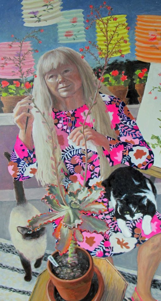The geraniums are real. Some are over 20 years old. The Japanese lanterns are on loan from a friend at Tamarack Gallery. The black & white cat is my dear Picasso; the Siamese is sweet little Bernie Sanders, mouser extraordinaire. They love hanging out in the studio, constantly begging for treats.
