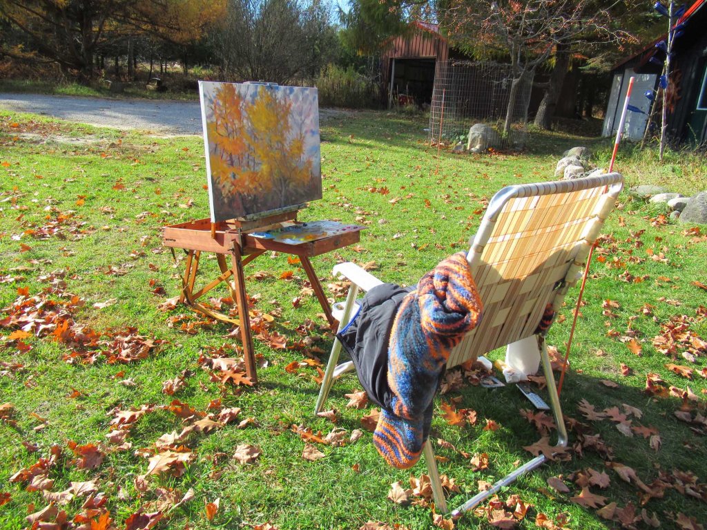 Another fabulous day here in northern Michigan! Sunny and close to 70. Gentle breeze. Wind chimes clanging. Truly paradise! Rain returns tomorrow, of course. I didn’t have to go far to find a good spot: these tamaracks are right along my driveway. Quite luxurious — I could mosey in to get coffee, check emails, call friends, etc. Rarely is it ever this easy or convenient!