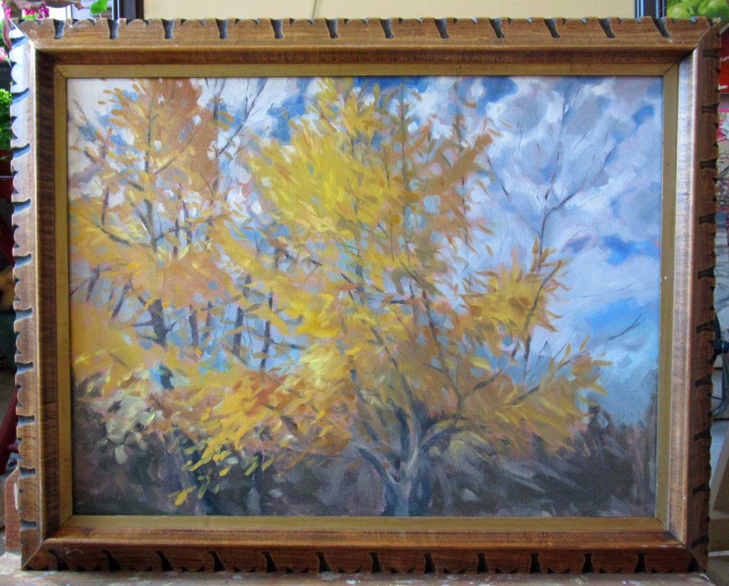 I just happened to have a frame for this canvas. I found it in a Re-Store shop a year or two ago. It was grimy as hell, but after scrubbing it with Murphey’s Oil Soap several time, its natural wood color shone through. I think it goes quite well with this painting, don’t you?