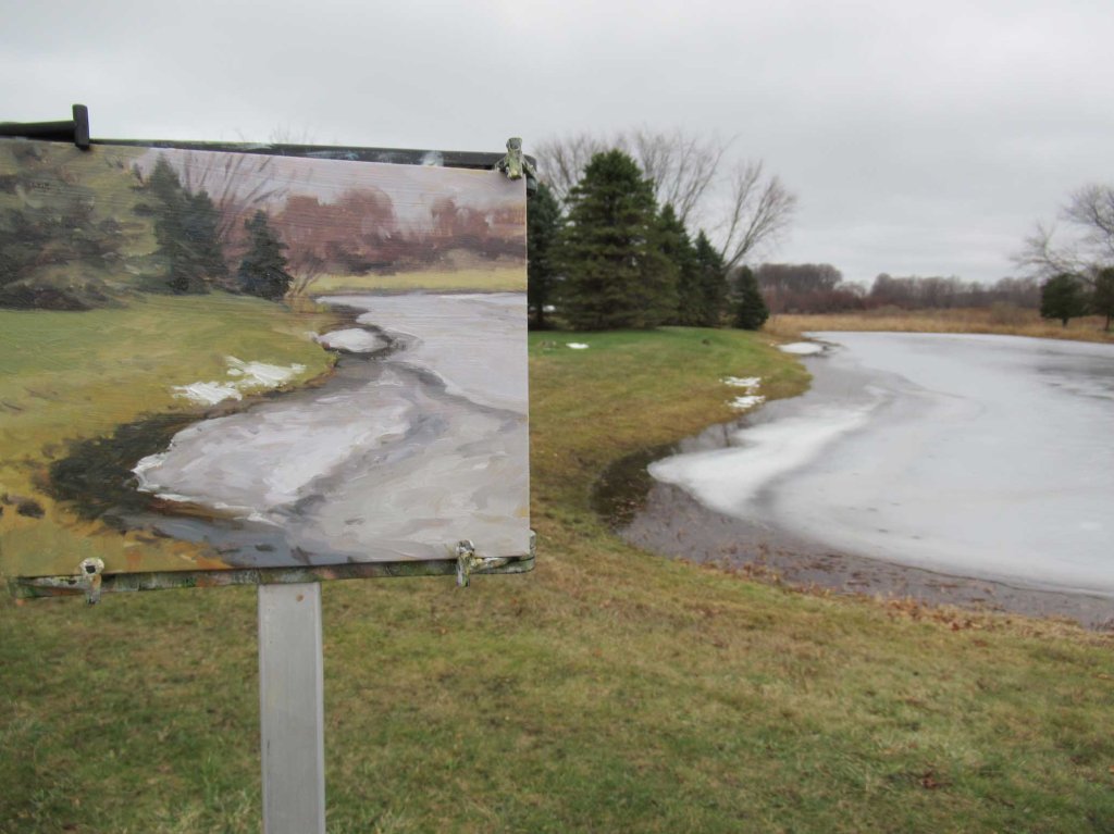 My goal this morning was to paint a “very interesting dismal” landscape. As opposed to a “very boring dismal” one. Alas — I searched for miles and could find only boring, pathetic, predictable views. Then I settled on this scene of the little pond at Norwood. In summer there’s a raft that’s usually covered in dozens of turtles sunning themselves. As I painted, a raccoon appeared and was very occupied with something in the lawn. He didn’t notice me until I started disassembling the easel. Then it started raining, so that was the extent of my “interesting dismal” views today. Sigh….there’s always housework I could do…