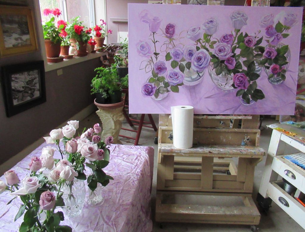 It was one of those days to work in bits & pieces. I’d paint a little, then go do yard chores. Top off the water softener with salt. Tie down the canoe. Secure the plastic tarps. You know how it is. Menial tasks to clear the mind. I’m inching along on this painting, hoping the roses hold out. So far they’re OK. Keep your fingers crossed….