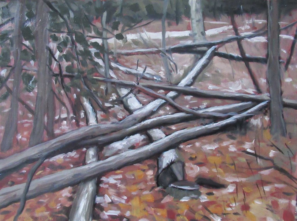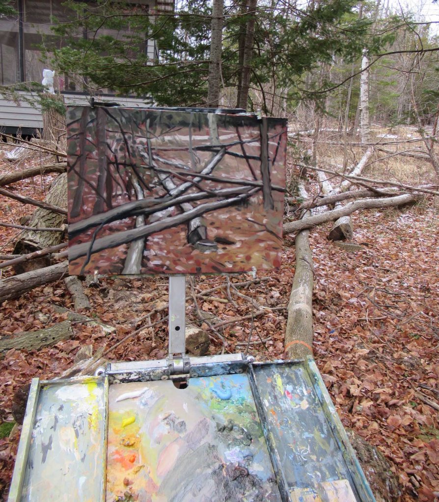 Many years ago a psychic told me, “When you’re not painting you’re like a nervous, fluttery little bird.” True! I wanted to paint something today — but what? Please — no more roses for a while! Even painted my hiking boots yesterday out of desperation. Yes, I wanted to paint something but I didn’t want to have to GO anywhere. My astrological ascendent is Cancer the Crab — a real homebody. I LOVE being home, here in the woods. Peace and quiet! I walked out to the compost pile and took a gander at this pile of trees. Aha! That’s where I set up. Notice the convenient stump on the right. Perfect spot for my can of turps!