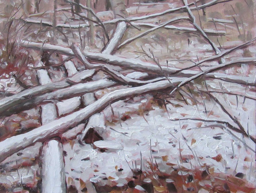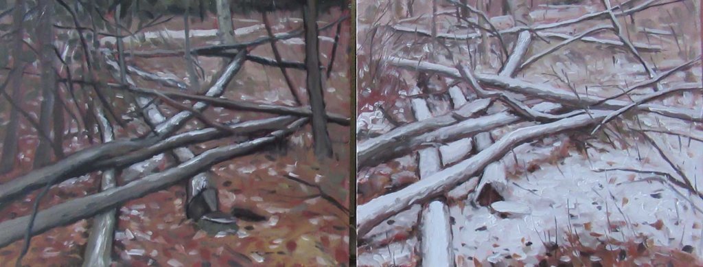We had 1/2″ of snow fall last night and I must be getting old. I didn’t want to go out in it. Brrrrr! But after watching a couple Facebook videos of giant jungle snakes (!) I decided wandering in the snow isn’t so bad. I’m drawn to this spot in back of the compost pile. Yesterday I painted this same view, so I thought it’d be fun to show how different things can look with a light cover of snow.