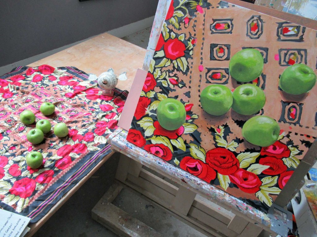 I hadn’t posted in a couple days because one day this thing looked so hideous I just didn’t want to unleash its horribleness upon the world. Then yesterday I joined about 2 billion other people trying to get groceries ahead of the upcoming major snow storm. But today I decided to be good and tough it out – it was that – or wash floors. Ugh! It was tricky to try to figure out how to handle the wrinkles in the silk scarf at first. And even something as simple as Granny Smith apples can be murderously difficult! I somehow managed to get a lot done today and had to quit when everything was gloopy-wet. Let’s see what tomorrow brings….