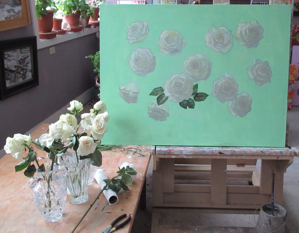 At first I panicked — how could I paint sometime so pitiful? But I decided to give it a try anyway. Another surprising thing: white roses aren’t really white! Here’s now things look at the end of Day 1: