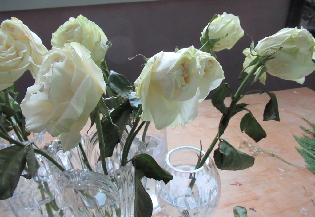 I finally was able to get out of my driveway on Tuesday (after our 2nd Snowmageddon of the season) and went to Traverse City in search of white roses. I saw 3 bunches in the grocery stores but they all looked pretty bad: brown petals. Ach! No good! I finally stopped to look in Elk Rapids and found what I thought were beautiful blooms. When I got home and unwrapped them, all the leaves were shriveled and crispy. Sigh. What to do?