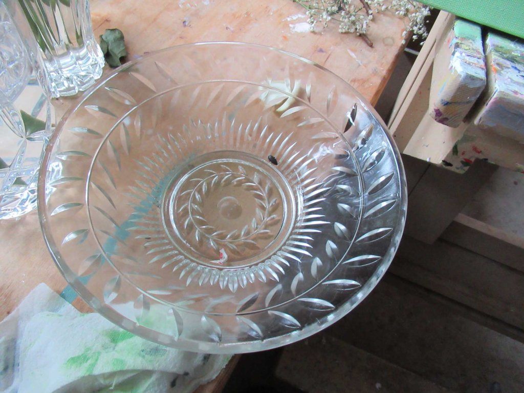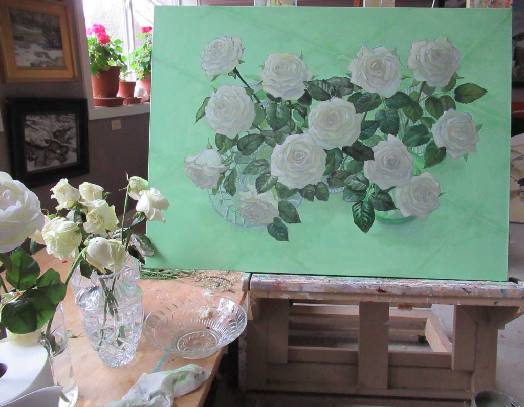 When I crawled into bed last night I thought: you need to add some vases and fabric wrinkles. So today I fiddled around, inventing a tablecloth with wrinkles (OK — folds) and some vases and shadows. I dug around in the back room and found a really cool bowl I hadn’t ever painted before. Now it’s a favorite!