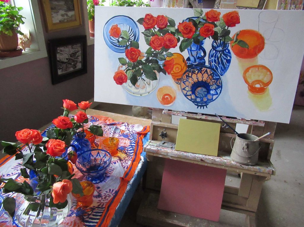 Gooey and wet…. I have all surfaces covered in wet oil paint today. After things dry in another day or so (I use Liquin, which helps), I can go back in and put in the fabric designs and some of the glasswear details. That blue bowl is just a bugger to paint! I’ve painted it a nuymber of times already and it remains quite challenging! Surely there’s a mathematical formula for the design, but math was NOT my best subject. I should have been a mechanic. Long story there….