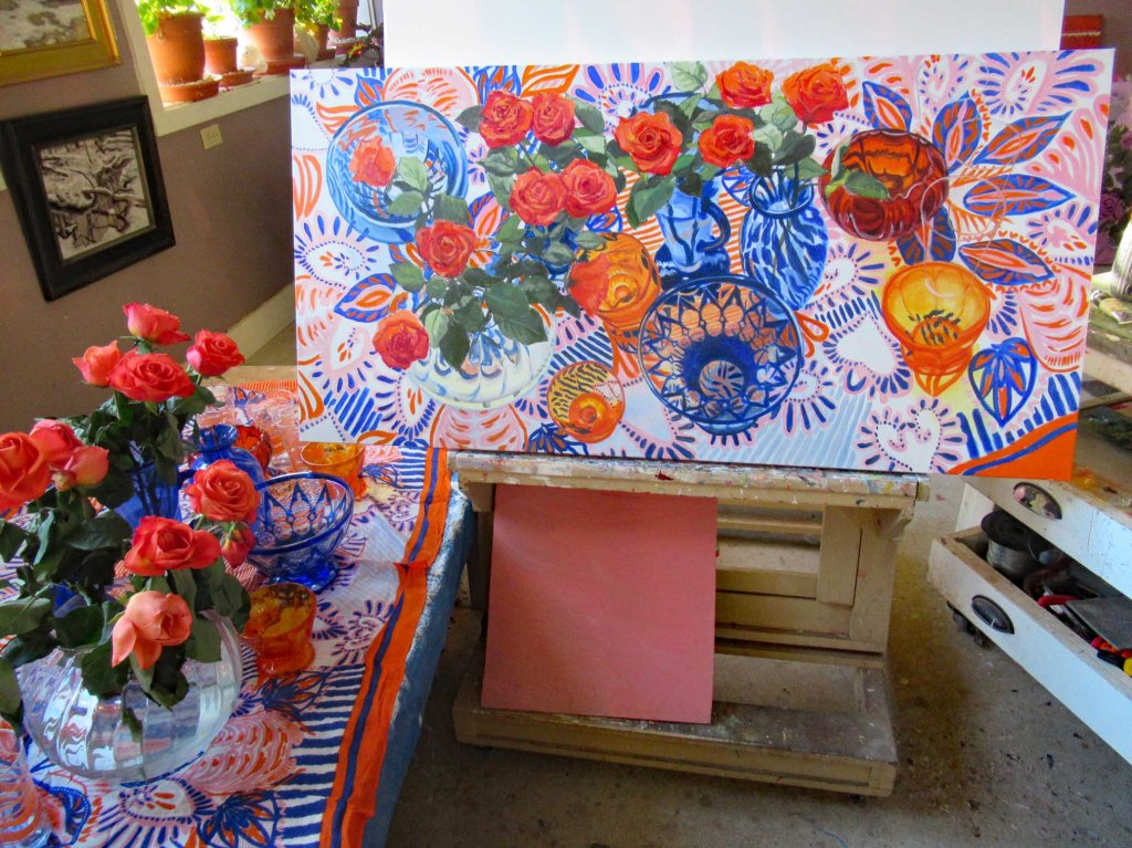 Mostly I worked on the tablecloth today, touching up details here and there. My next conentration will be in the upper right area where there will be 3 glasses. I had to paint in the background first and let it dry. Tomorrow I’ll paint the backsides of the glasses designs — if it’s dry enough to work over. Once that’s dry I’ll paint the front designs. Oh — and I think there’s another glass over on the left side somewhere. My eyeballs are falling out!