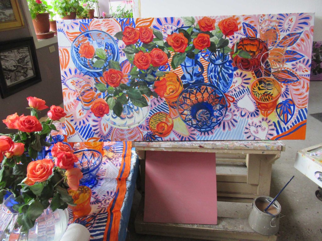 Mostly what I did today was darken up some of the shadow areas and start working on the 4 water glasses. The paint was too gooey to get too far with those. Hopefully by tomorrow it’ll be dry enough to finish.
