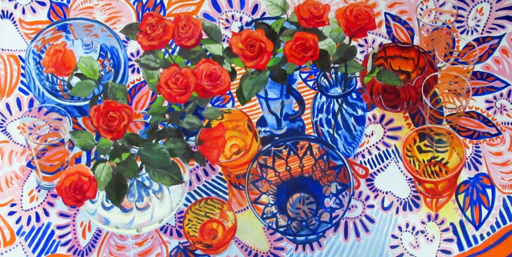 orange roses indeed; like life, you need a shoe horn to get in that picture!; Wow and double WOW!! BLUE against RED, stripes vs rounds; Flowers against glass; somebody call the doctor, I’m fainting. love it though.