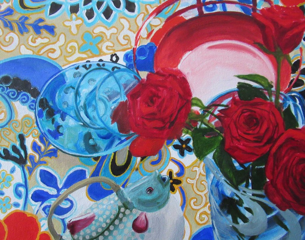 The “little pile of cups and saucers” certainly adds an interesting twist to your glass paining .. and I bet some complexity too!!