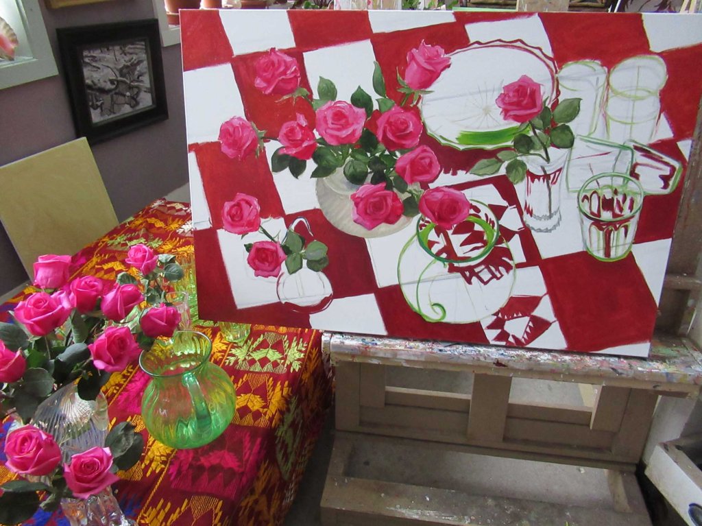 Gosh! That is a lot to accomplish in an hour. Also, when I was looking at the red checks, I thought, “That isn’t what she showed us yesterday.” Then I realized this is the background. GRACIOUS! Having to paint all the details of that cloth is going to be a bear – said someone who has no clue what she is talking about.