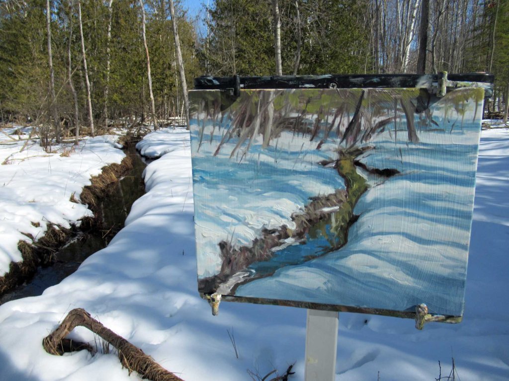 I had to leave my studio painting dry a bit more for another day. The sun was shining! A rare thing here in northern Michigan. I set up my easel in back of the studio, next to the creek. I’ve painted this many times but it still fascinates me.