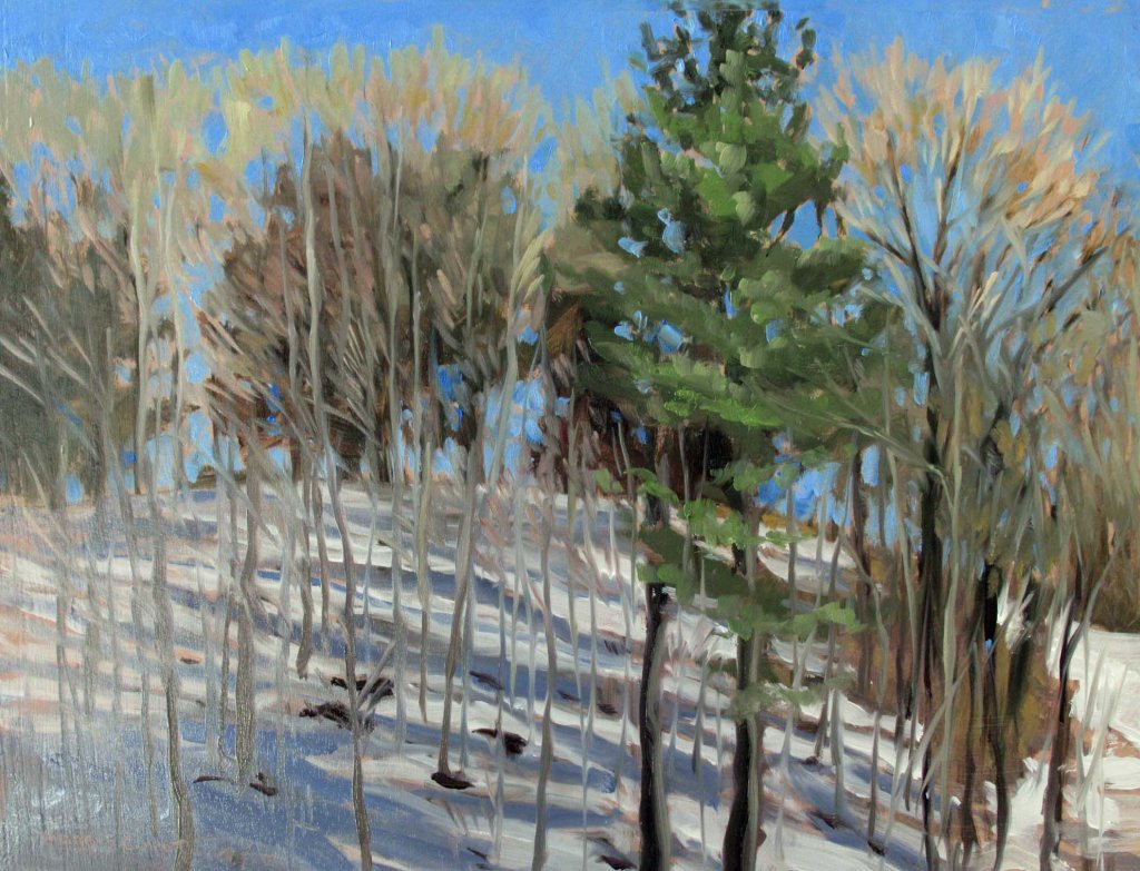 If you lived in northern Michigan, you’d know how exciting it is to finally see a clear, blue sky in winter! We go weeks — months? — with cloudy skies. A couple days ago I noticed this view — which is along my driveway — and was stuck by the bright blue sky. I’d already done 2 plein airs that day and was getting tired. So I knew what I’d be painting today. It was pretty tricky to paint — all those light and dark colors in gooey-wet oil paint! Ach! I wasn’t sure if I could get it to turn out, but I think it gets the point across.