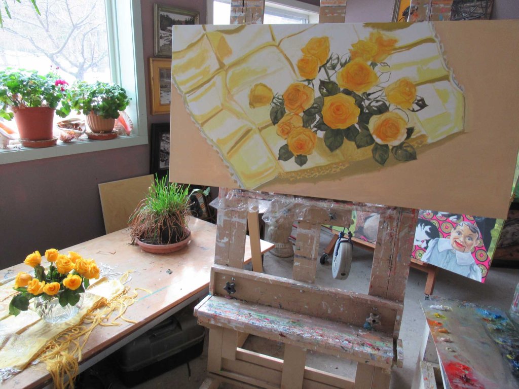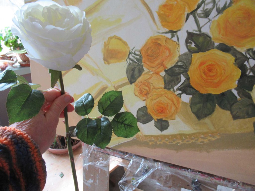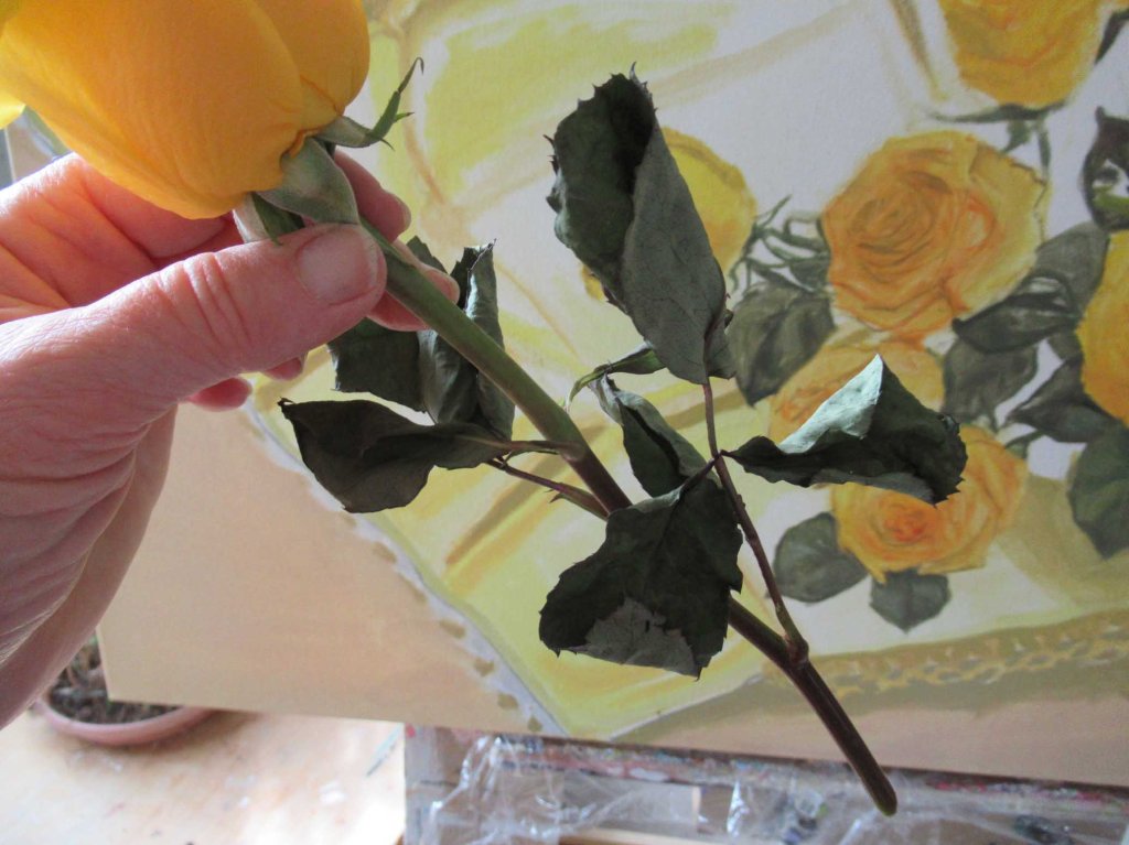 Sometimes you just have to settle for the fake stuff. Luckily, I have a beautiful silk rose whose leaves are always perfect. The yellow roses were bought just two days ago and already their leaves are toast.