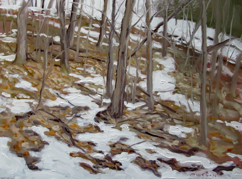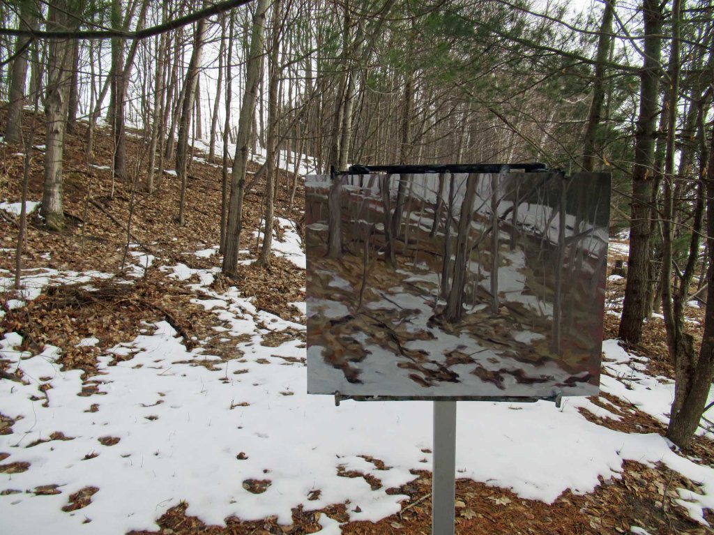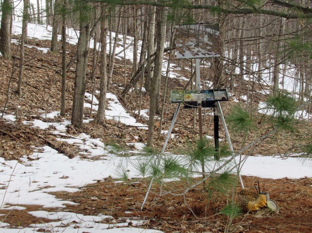 It was a chilly, cloudy day here and I didn’t really plan on going out to paint. I’d resigned myself to painting the sides of paintings. But then I got the “bug” this afternoon, wandering around with my little viewfinder. What was paintable? What would the Canadian Group of Seven paint? I thought this view would be interesting (= challenging). It’s right outside my door, looking up at the hillside. I was trying to channel the spirit of the great Canadian painter Tom Thomson. Ha ha.