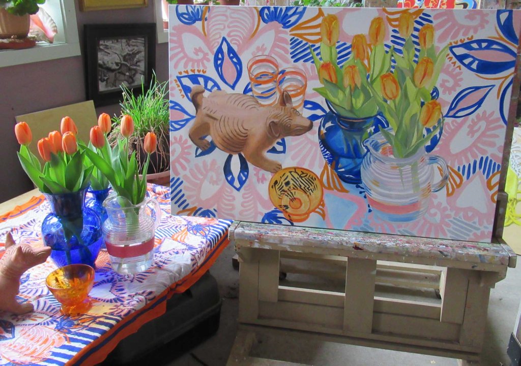 I took advantage of the nice weather yesterday to run errands in Traverse City (a.k.a. “the Paris of the North”) and didn’t touch this painting. But today I was up and running on it. Mostly I painted the patterns in the cloth – which are harder than you’d think. Realized things would have gone a lot quicker for me if I’d painted the entire background white to start. Once today’s paint job is dry I’ll have to go back in and paint all the empty spaces (and crevices) white. Oh joy!