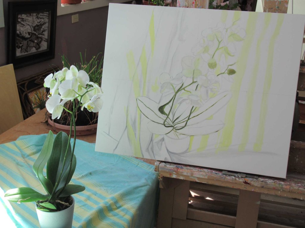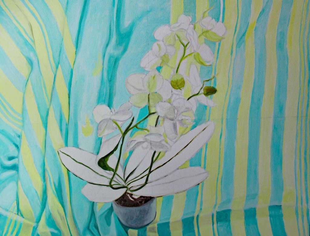 This is actually Day 2. Yesterday it looked rather ghastly. Hard to photograph. I didn’t want to insult my followers by posting it. Of course I’m posting it now — ha ha! Maybe it wouldn’t have looked so awful if I’d painted more of the orchid first. But those stripes on the fabric captured my attention. HAD to nail those suckers first!