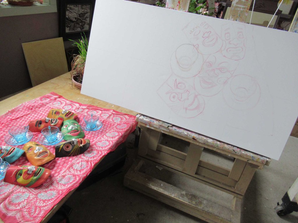 Yesterday I hit a most fascinating estate sale. The owner had enjoyed exotic treasures from around the world. As soon as I saw these masks I knew I’d have to do a painting with them. Here’s my setup (above).