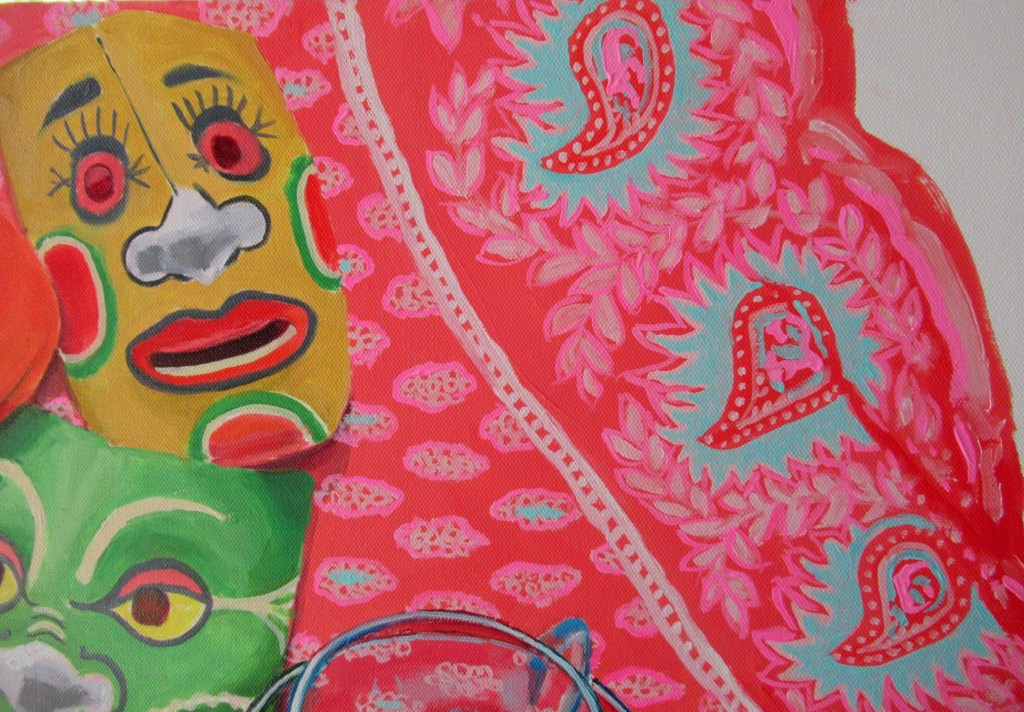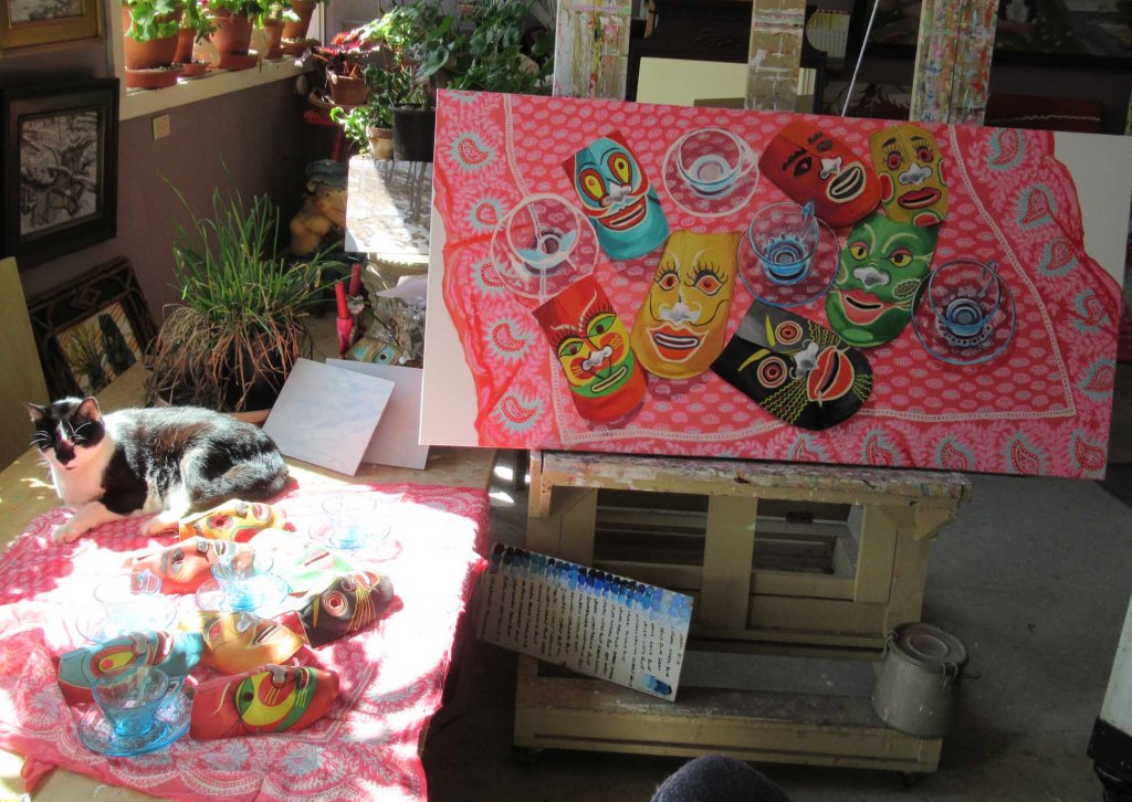 It doesn’t look like I did anything to this painting today, but I did. My mouth was sore from a trip to the dentist and I didn’t really trust myself to hack away on the doggone teacups and their miserable elipses. So I took a safer route, slapping the screaming-hot-pink (a.k.a. “Aurora Pink” by Shinhan) around just about everything on the tablecloth. The cat was there for moral support. My little nursemaid.