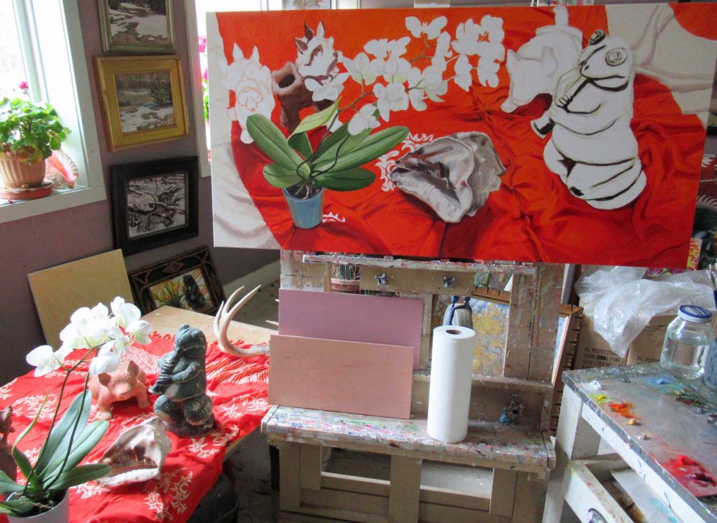…And just the perfect day to paint lots of bright reds! I was happy that I didn’t have to GO anywhere. Just splash on the fiery reds. My kind of day! Fingers were beginning to stiffen up a little, so I put things away and celebrated a productive day by starting a flatful of zinnia seeds out in the potting shed. Life is good!