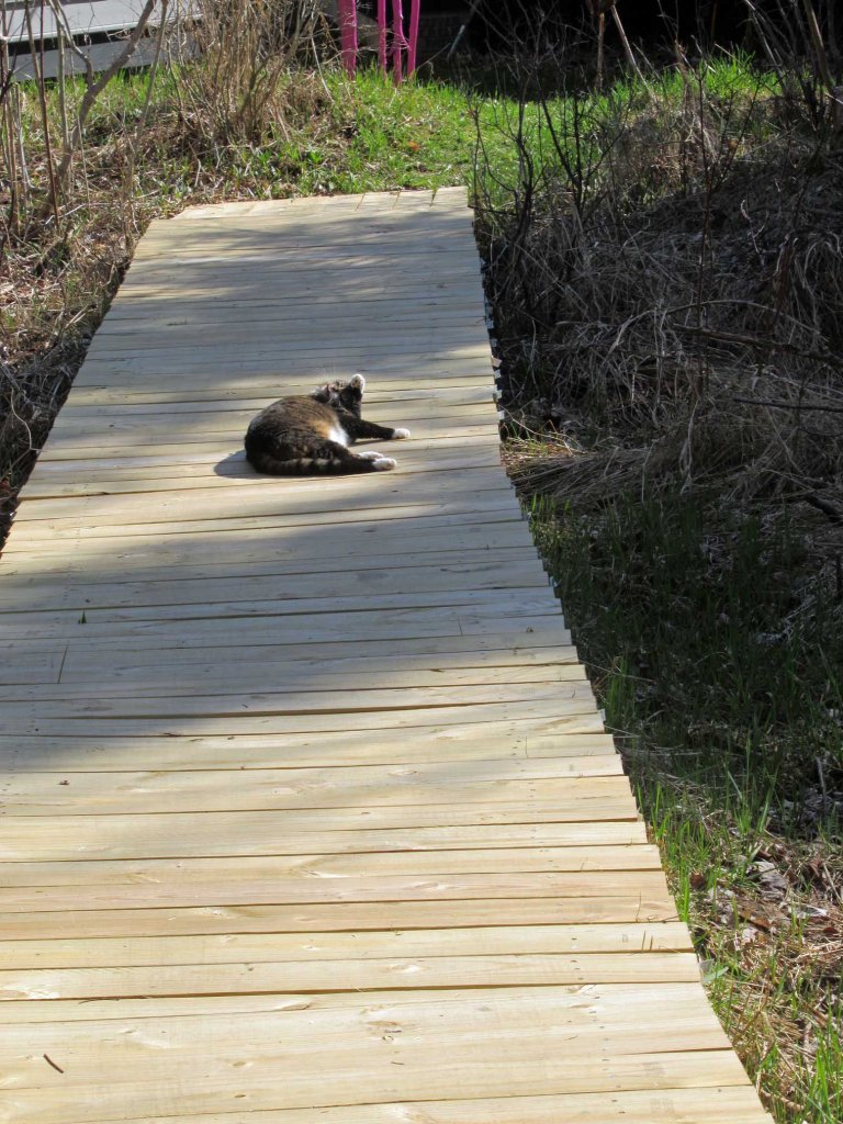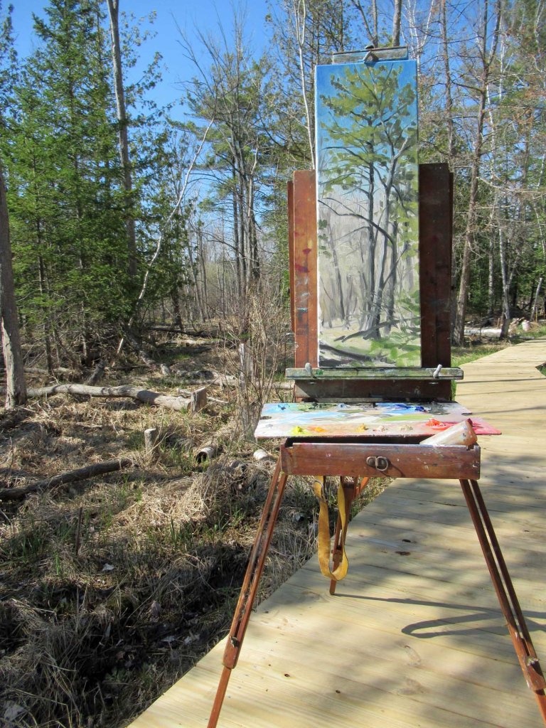 I was almost too tired to paint today. I’d dug up three azaleas that had been in the ground at least 10 years. Realized they were in the wrong place. Enlarged one of the flower beds and removed most of the soil (which was about 99% sand). Replanted the azaleas with lots of sphagnum peat, watered well and replaced the stone border. That pretty much did me in. But by the “miracle of coffee”, I revived enough this afternoon and set up on the Swamp Path to paint this view of one of the white pines. It was a miracle, too, that I didn’t step off the walkway and fall into the swamp!