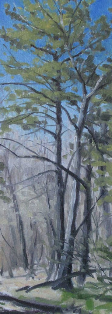 I’d always liked this view of that pine. And I had some 8×24″ canvases sitting in the back room. I think it’s a very odd size, but it seemed like just the thing to paint a tall, skinny tree. I may (or may not) touch this up a little bit later on. Too tired to think about it any more today;