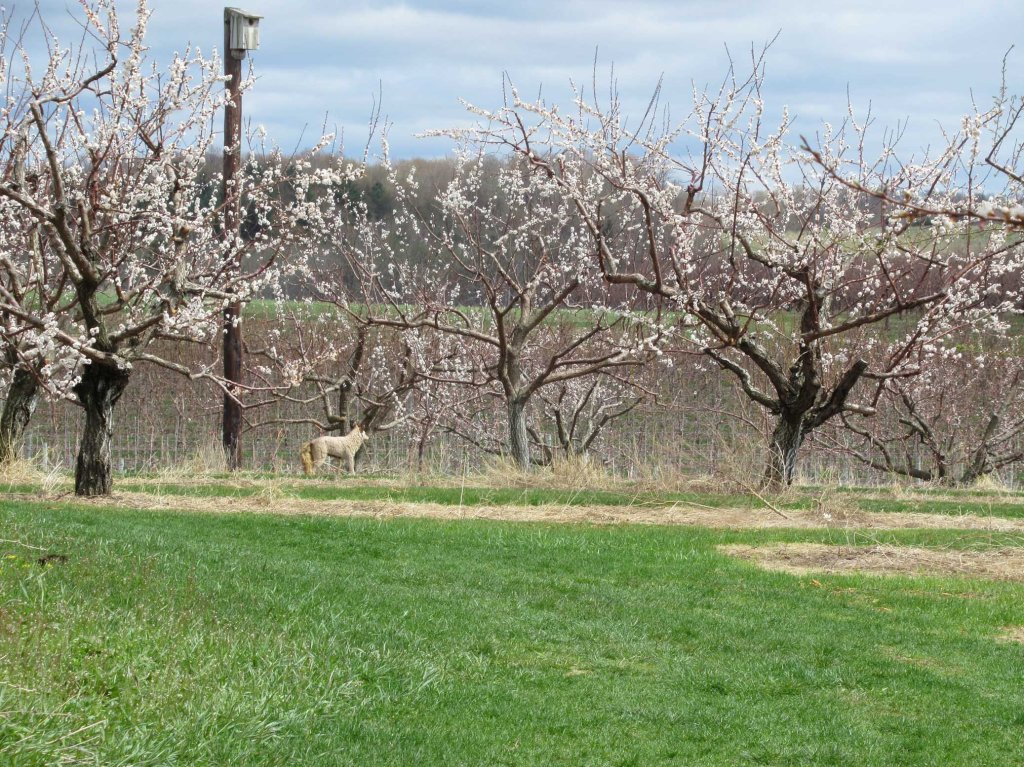 I went to the orchard, but couldn’t get inspired. Orchards are wonderful, but too “regimented” to get a nice painting, it seems. Too orderly! Then I saw what looked like a dog in the distance. Was he friendly? Always a worry for a cat person.