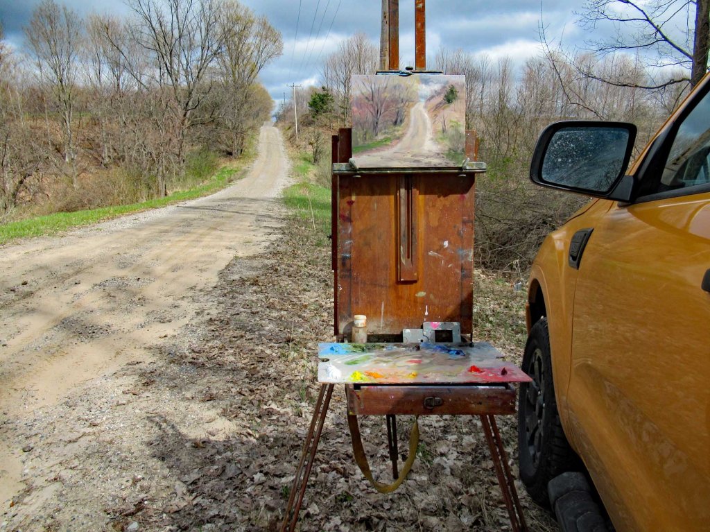 So I took off down a nearby seasonal road and ended up painting this view of the early bits of green. The raindrops held off just long enough for me to whip this one out.