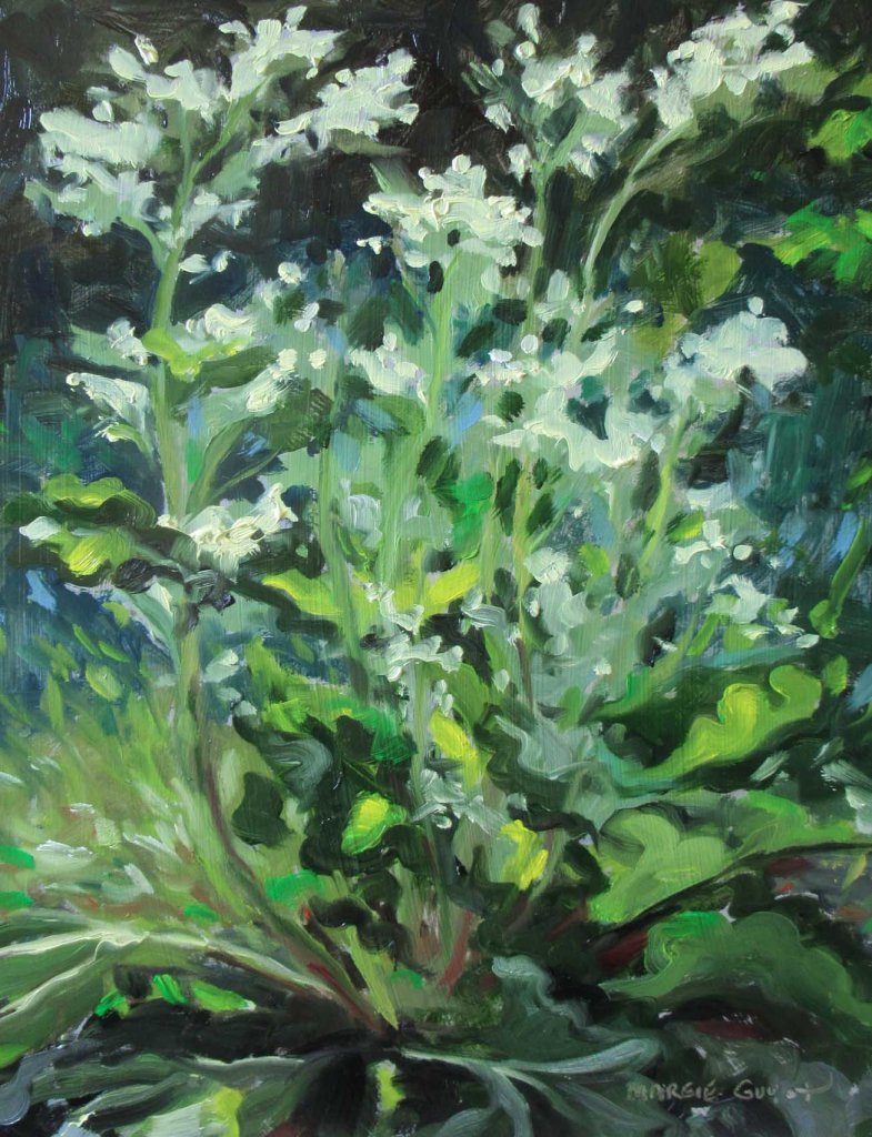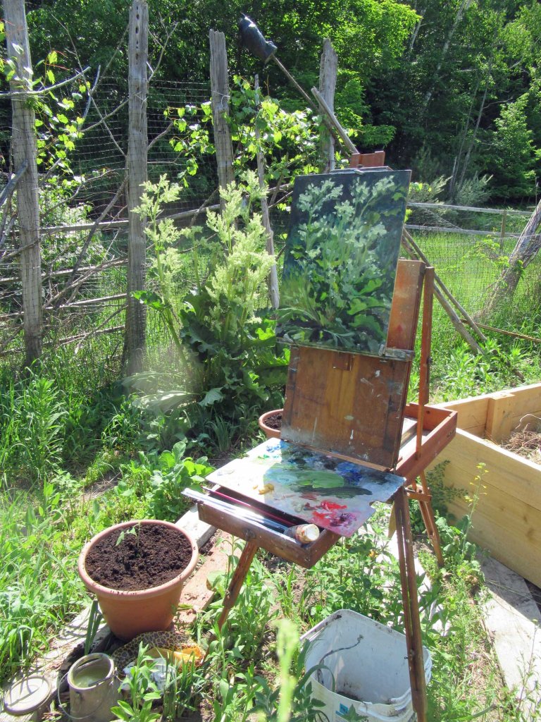 I hadn’t lifted a brush in a month, thanks to a crippling case of sciatica! Today was the first day I could paint. And we’re right at the height of getting our gardens planted, so it’s been pretty frustrating to have to lay around. I’d just potted up some tomato plants when I looked over and saw my rhubarb plant. It was flowering and so beautiful I just had to paint it!
