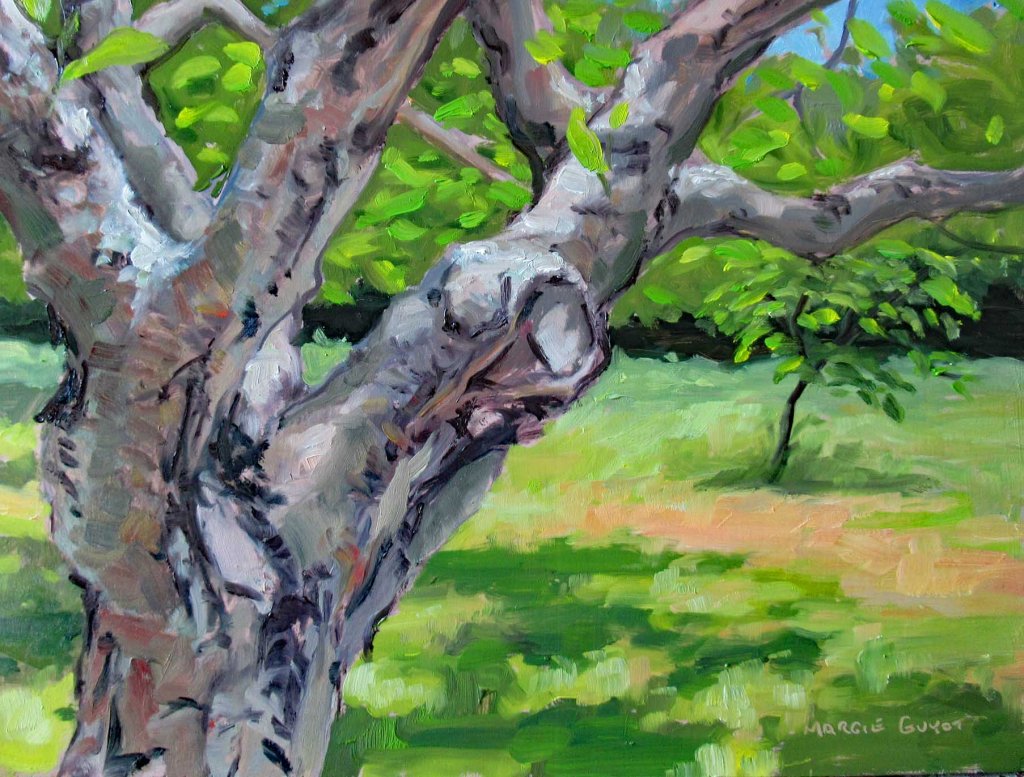 “Apple Orchard just a simple picture; a tree trunk (apple) with with mid greenery and distant trees; nothing spectacular; simple concept but look again; the sure mastery of the detailing of the apple tree; both simple and profound, everything in this pic bespeaks peace, charm, quietness, the artist captures yet more; the mid range and then distant views complete the picture giving the concept you are surrounded by nature herself; the colors intermingle with concept; greens and greys, with occasional shout of sparkling early spring’s bright green.