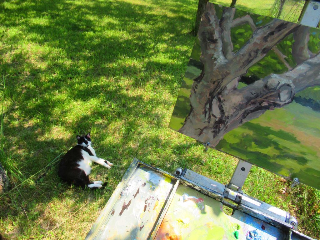 It’d been a very chilly, dark, rainy week here, but today the skies magically cleared (!) and people finally took off their jackets. I even took off my longjohns! This view had caught my eye all week on my trips out to the potting shed. Finally this afternoon I couldn’t stand it any longer and got out my paints. Supervised as usual by my dear, old cat, Picasso. Sometimes I’d stop an give him belly rubs.