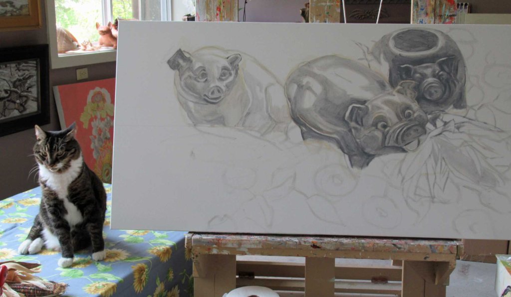 I’d sworn to friends just lately that I was DONE with still lifes. I was going back to landscapes. And of course now I’m working on a painting with pigs. I couldn’t explain, other than that they were calling to me. Some are piggie banks. One is a milk pitcher. Another is a flower pot. I’ve collected a few over the years and they were making me smile. I thought I’d start out doing a grissale (sp? I don’t know — I was a music major). Anyway, by doing the drawing in shades of gray, it theoretically seems easier to make corrections.
