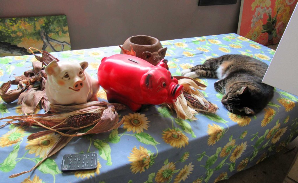 I’ve been more-or-less laid up this summer with sciatica and sitting on my hiney in a cool studio with a cat or two, painting smiling piggies seems like just the thing to do.