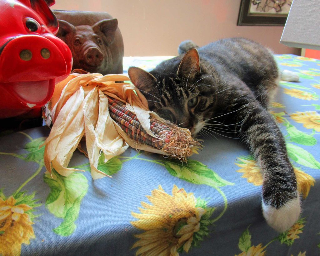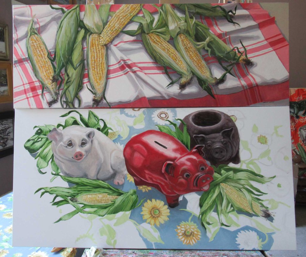 All I had to use when setting up this still life was last year’s dusty, dried Indian corn. Today I magically changed it into sweet corn for the painting. As I began painting the tablecloth I could hear thunder booming to the south. Traverse City? Picasso, my #1 cat, surprised me on my coffee break when he came prancing out of the weeds with a chipmunk in his mouth! He didn’t hurt it, though. He’s a “catch and release” type of guy. Just wanted to show his momma “I still got it!”