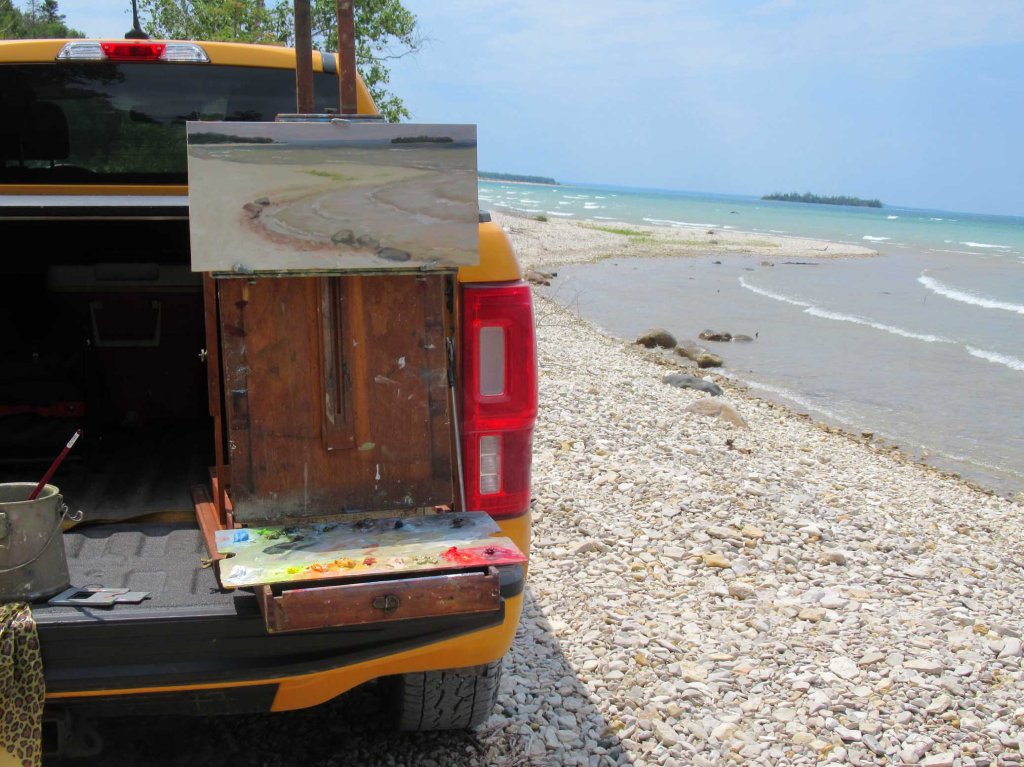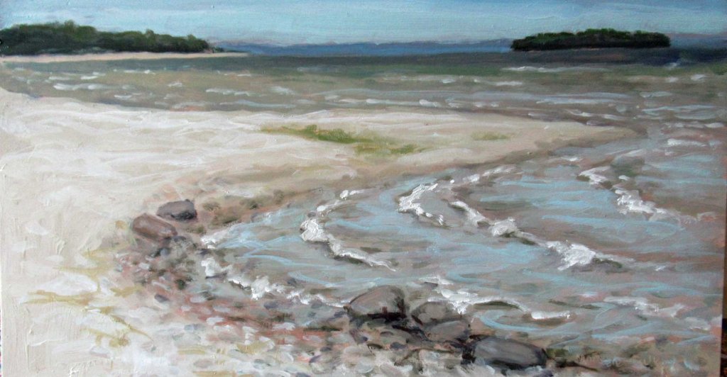 Fisherman’s Island is on the right; the mainland is on the left. The blue in the distance is the little town of Northport at the tip of the Leelanau Peninsula. People say the water had been low enough years ago it was possible to walk over to the island on a narrow path of rocks. This is a beautiful state park just south of Charlevoix with plenty of beaches, hiking trails and camping. If you want to paint water, this is where to go.